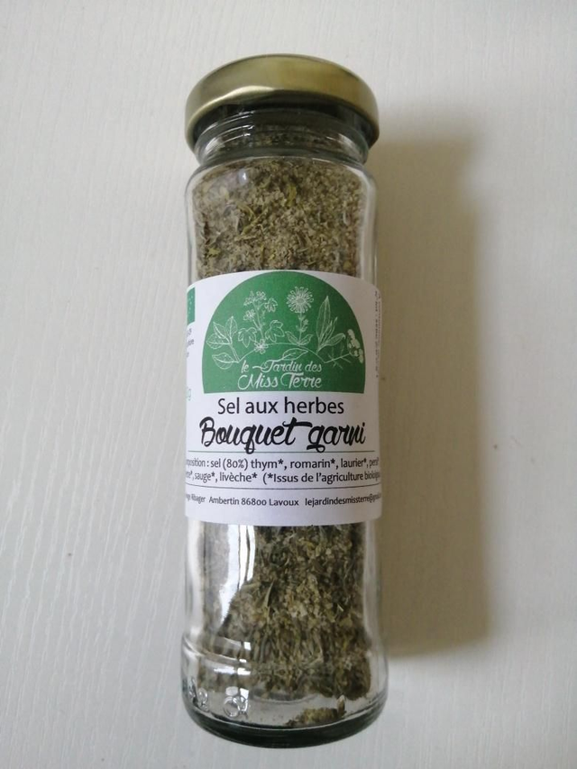 Sel de Guérande labellisé Nature et Progrès + 20% de mélange aromatique bio* : thym, romarin, laurier, persil, sarriette, sauge, livèche