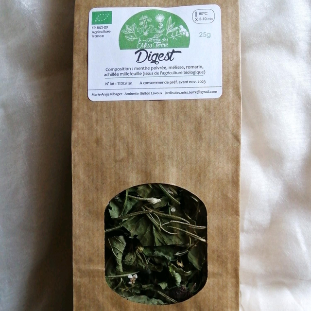 Tisane bio* (25g) composée de feuilles de romarin, menthe poivrée (ou menthe verte en fonction des stocks), mélisse et fleurs d'achillée millefeuille