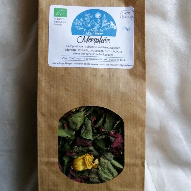 Tisane bio* (20g) composée d'aubépine, feuilles de mélisse, et aspérule odorante, fleurs de lavande, coquelicot et pavot de Californie